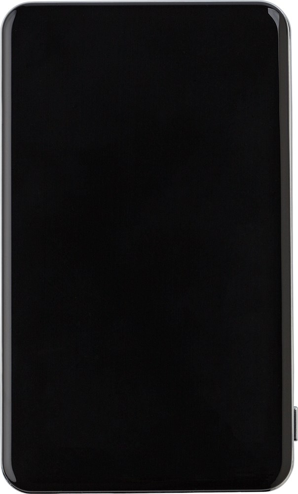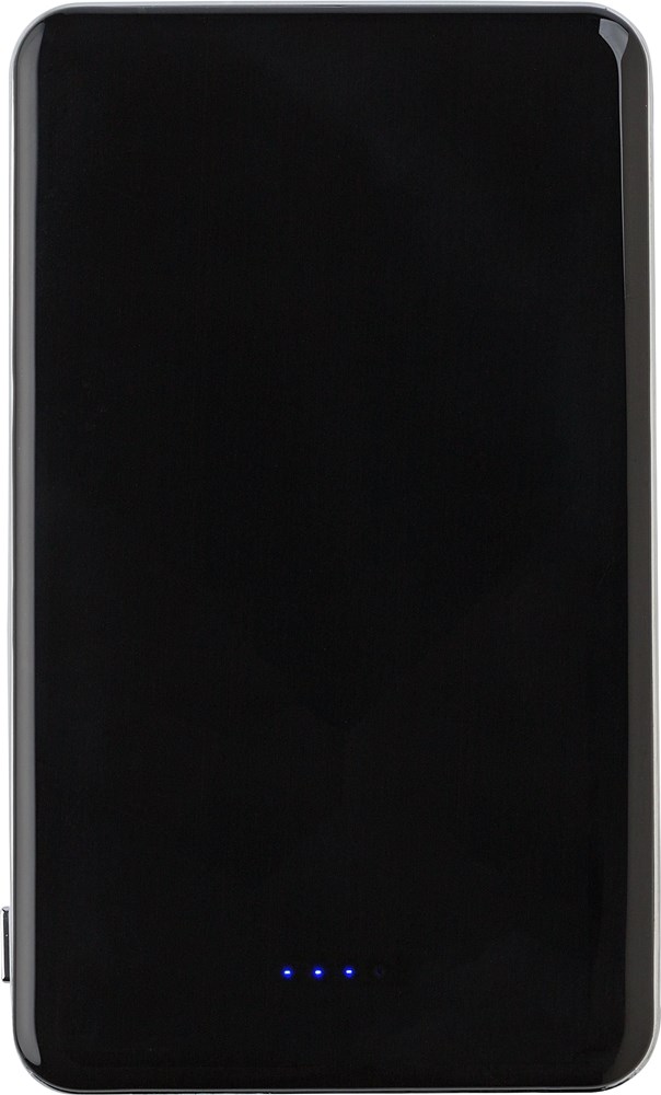 Kunststof Li-polymeer powerbank met capaciteit van 5.000mAh, ingang van 5V/1.000mA en uitgang van 1.500mA/2.100mA/5V. Incl. vijf blauwe LED indicatielampjes en witte USB/micro USB kabel (ongeveer 32 cm), geschikt voor de meeste mobiele apparaten.
