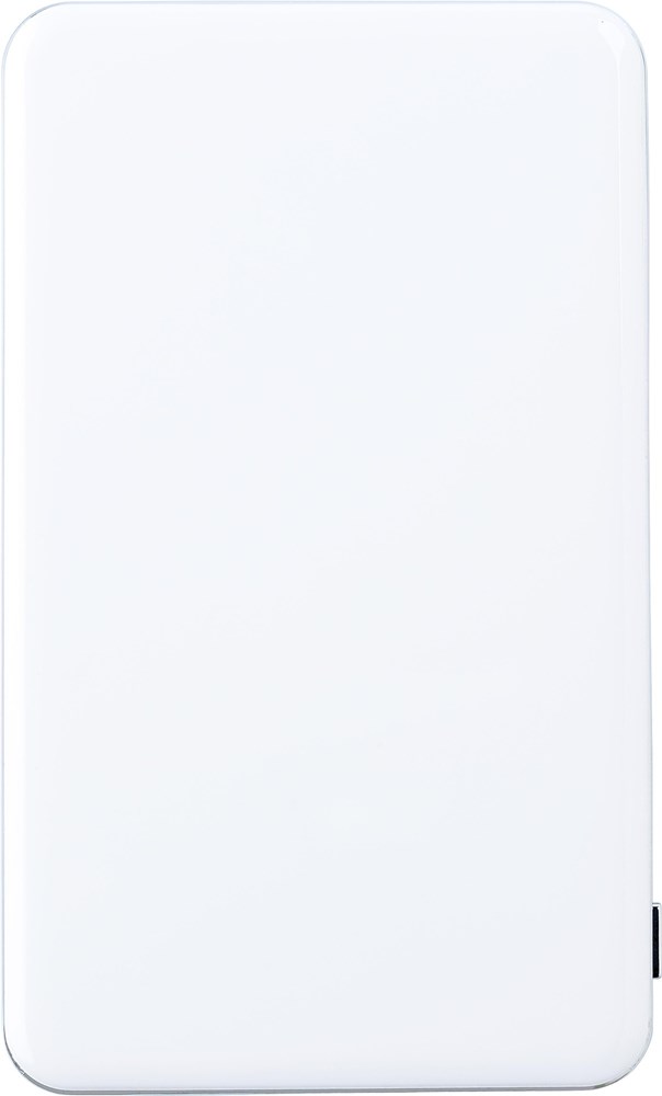 Kunststof Li-polymeer powerbank met capaciteit van 5.000mAh, ingang van 5V/1.000mA en uitgang van 1.500mA/2.100mA/5V. Incl. vijf blauwe LED indicatielampjes en witte USB/micro USB kabel (ongeveer 32 cm), geschikt voor de meeste mobiele apparaten.