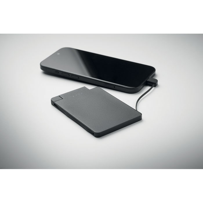 Powerbank van 2500 mAh in ABS met ingebouwde kabels in creditcardformaat. Deze powerbank past op iOs telefoons met magnetische functies. Ingang: Type-C en uitgang Type-C en compatibel met IOS-apparaten.