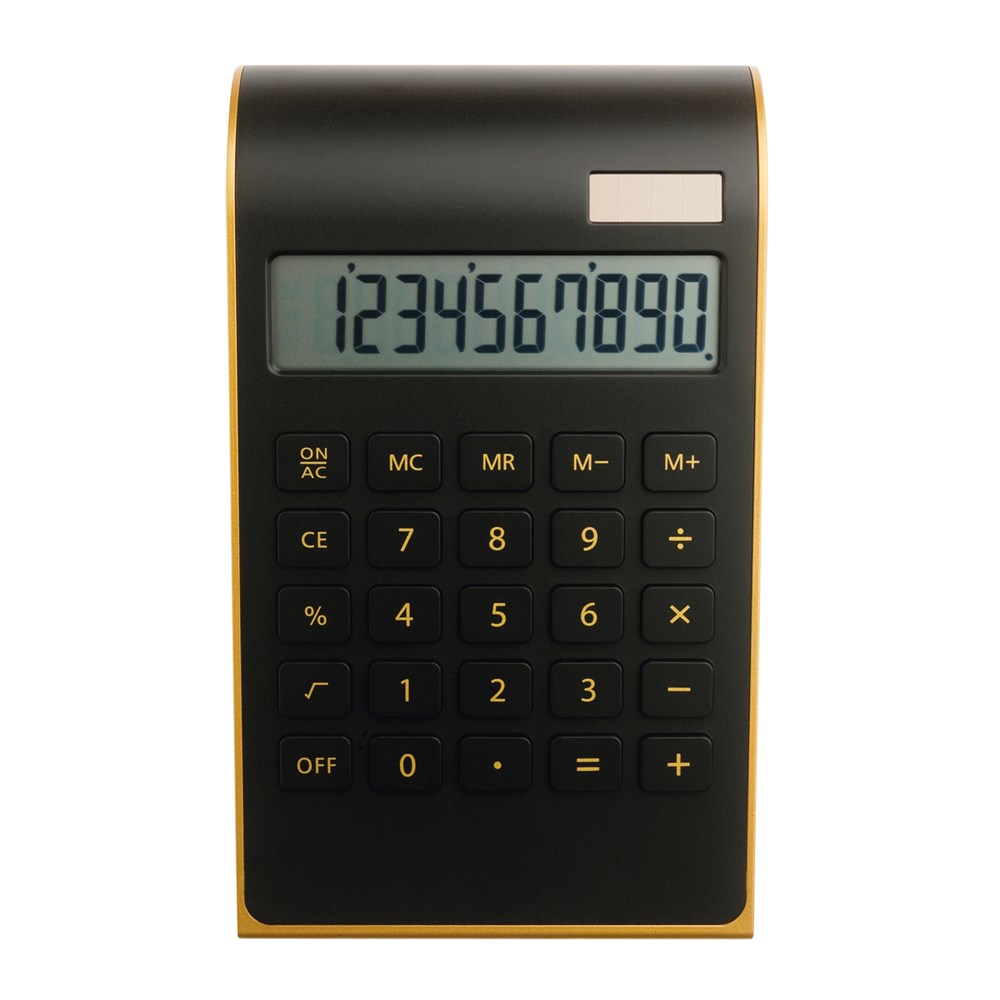 Mooie, gebogen rekenmachine met dual power (zonne-energie en batterij). De zijkanten van de rekenmachine zijn verschillend van kleur en vormen een aantrekkelijk contrast met het effen zwarte oppervlak. De vlakke knoppen van de rekenmachine zijn zwart en hebben een gold opdruk. Het goed zichtbare oppervlak kan via tampondruk (1 tot 4c) of UV-bedrukking met een logo worden afgewerkt. Het display kan 10 tekens weergeven. De batterij is inbegrepen.