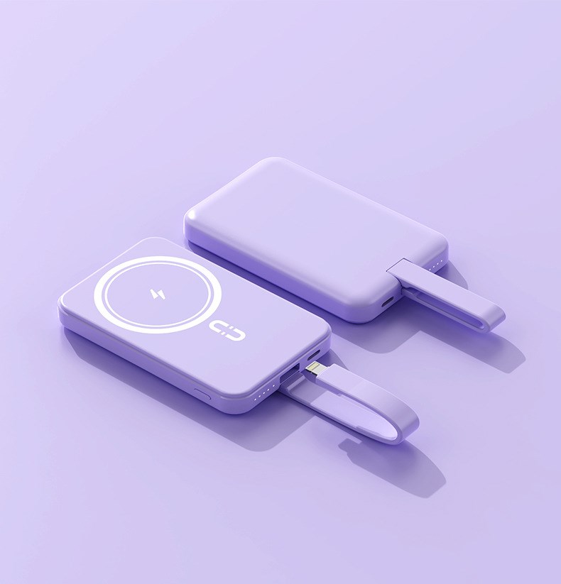 Draadloze powerbank met magnetisch oplaadoppervlak en geïntegreerde oplaadkabel (USB-C & Lightning). Voor de hechting heeft de smartphone een magnetische achterkant of een magnetische oplaadcase nodig. Capaciteit: 10.000 mAh. Afmetingen: ca. 108 x 68 x 19 mm. Kleuren: wit, lichtblauw, paars. Ingang USB-C: 5V/3A, 9V/2A, 12V/1,5A. Uitgang USB-C en Lightning: 5V/3A, 9V/2,2A, 12V/1,6A. Draadloos vermogen: 15W. Afwerking: 1c print op één positie inbegrepen. Verpakking: witte vouwdoos.