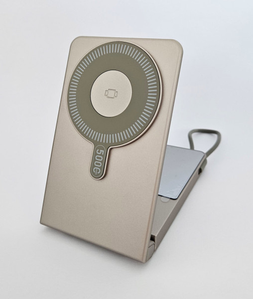 Draadloze powerbank met magnetisch oplaadoppervlak, kan rechtop worden gezet, met geïntegreerde oplaadkabel en spiegel. Voor de hechting heeft de smartphone een magnetische achterkant of een magnetische oplaadcase nodig. Capaciteit: 5.000 mAh. Afmetingen: ca. 112 x 69 x 13,5 mm. Ingang USB-C-poort: PD 18W. Ingang via geïntegreerde USB-C-kabel: PD 18W. Uitgang via geïntegreerde USB-C-kabel: PD 20W. Draadloos uitgangsvermogen: 15 W voor smartphones, 2,5 W voor horloges, 3 W voor in-ears. Kleuren: wit, zwart, goud. Afwerking: Inclusief 1c-afdruk op één positie. Verpakking: witte vouwdoos.