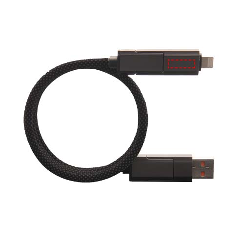 Deze ultrasnelle magnetische 100 W oplaadkabel, gemaakt van gerecyclede nylon snoeren en zinken doppen, heeft een digitaal display voor de stroomafgifte en is compatibel met laptops, tablets en smartphones. De kabel ondersteunt USB-A- en USB-C-ingangen en heeft CarPlay-functionaliteit. Geleverd in een recyclebaar TPU-zakje. Kabellengte: 1,5 meter.