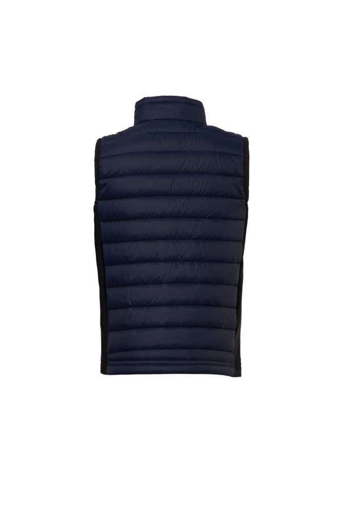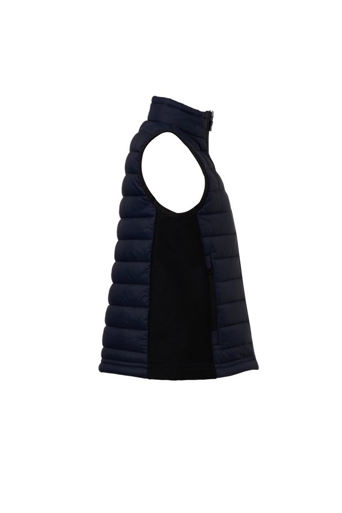 Gewatteerde bodywarmer voor kinderen, zijkanten in soft-shell, plastic ritssluiting met metalen “semi-auto lock” runner en gepersonaliseerd treklipje, twee zijzakken met ritsje.