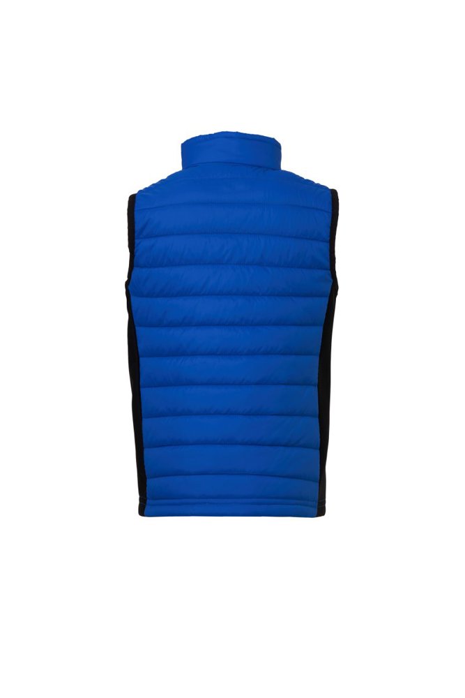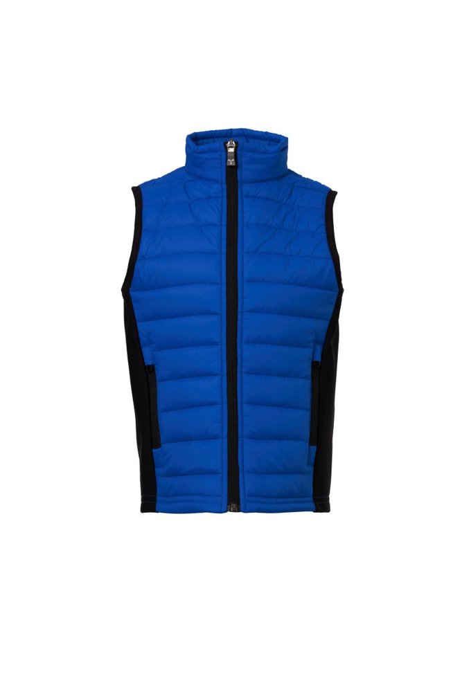 Gewatteerde bodywarmer voor kinderen, zijkanten in soft-shell, plastic ritssluiting met metalen “semi-auto lock” runner en gepersonaliseerd treklipje, twee zijzakken met ritsje.