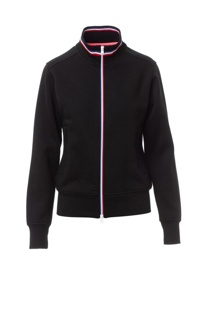 Nauwsluitend damessweatshirt met doorlopende kunststof SBS-rits in drie contrasterende kleuren met dubbele metalen runner, ribkraag met drie contrasterende kleuren, nauwsluitende mouwen, twee buitenzakken met ritssluiting, ribboorden met stretch aan de zoom en mouwen, versterkte naden.