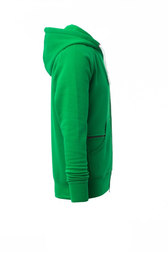 Herenhoodie met doorlopende geplastificeerde SBS-rits met dubbele metalen runner, capuchon met dubbel gestikte naden en wit trekkoord met contrasterend stiksel en metalen ringen, raglanmouwen, kangoeroezakken, kleine zak met rits, ribboorden met stretch aan de zoom en mouwen, versterkte naden.