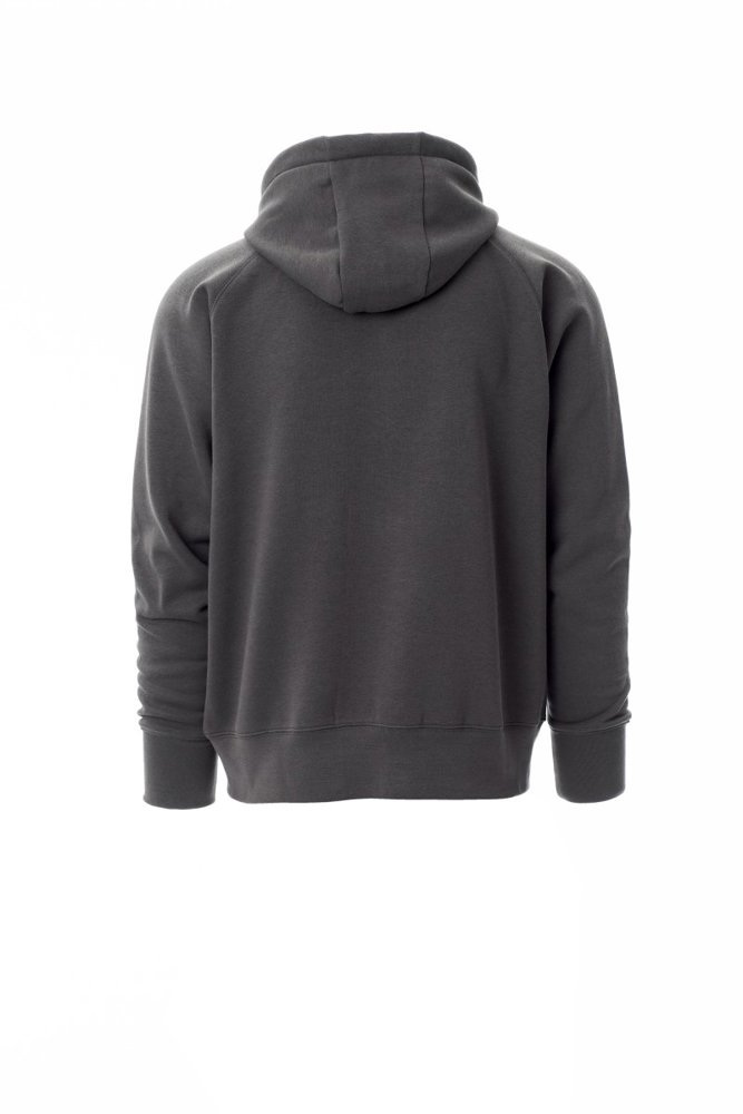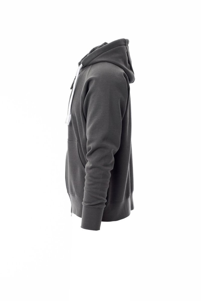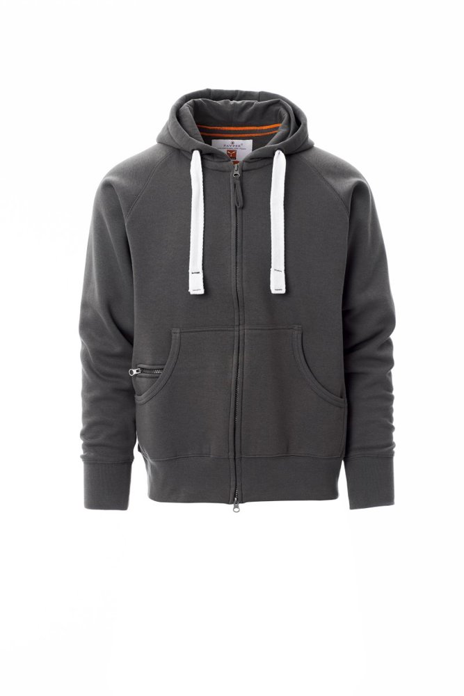 Herenhoodie met doorlopende geplastificeerde SBS-rits met dubbele metalen runner, capuchon met dubbel gestikte naden en wit trekkoord met contrasterend stiksel en metalen ringen, raglanmouwen, kangoeroezakken, kleine zak met rits, ribboorden met stretch aan de zoom en mouwen, versterkte naden.