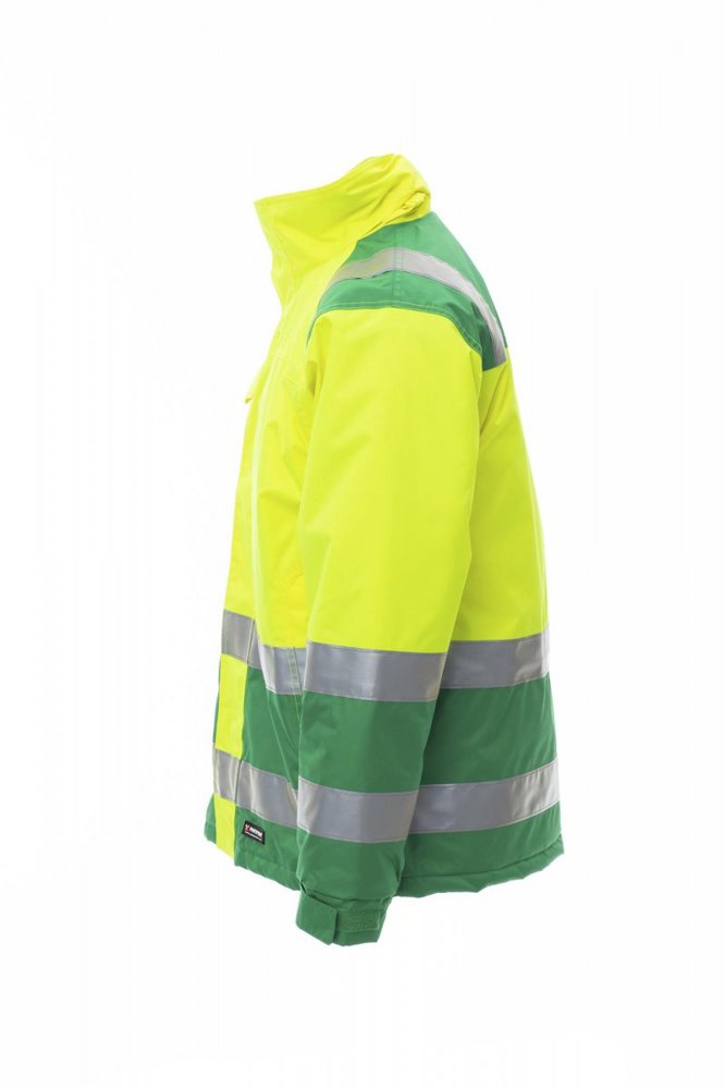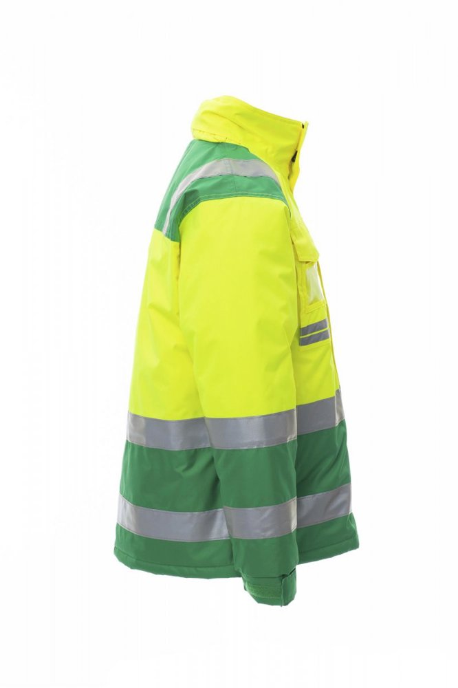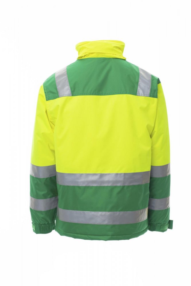 Tweekleurige herenjas met hoge zichtbaarheid, met reflecterende strepen, opening met kunststof rits met metalen runner met overslag en klittenband, uitvouwbare capuchon, mouwen met polssluiting, elastische, verstelbare manchetten, twee afgedekte zakken vooraan met rits, een borstzak met badgehouder afgedekt met een klep en gesloten met klittenband. Niet-afneembare gewatteerde binnenkant, met kraag en schouders van fleece, één binnenzak. Gesealde naden.