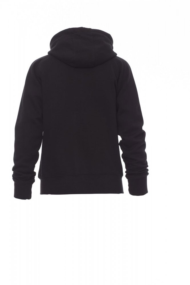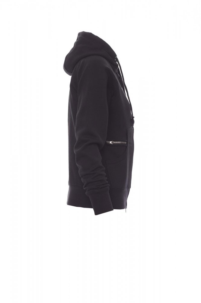 Nauwsluitende dameshoodie met doorlopende geplastificeerde SBS-rits met dubbele metalen runner, capuchon met dubbel gestikte naden en wit trekkoord met contrasterend stiksel en metalen ringen, raglanmouwen, kangoeroezakken, kleine zak met rits, ribboorden met stretch aan de zoom en mouwen, versterkte naden.