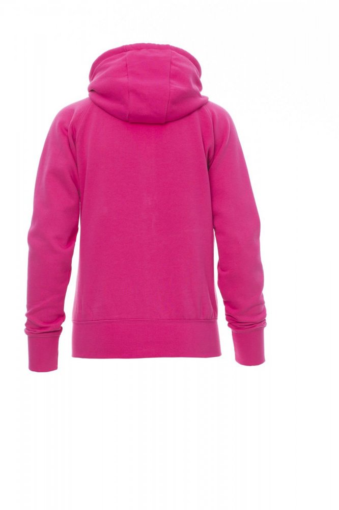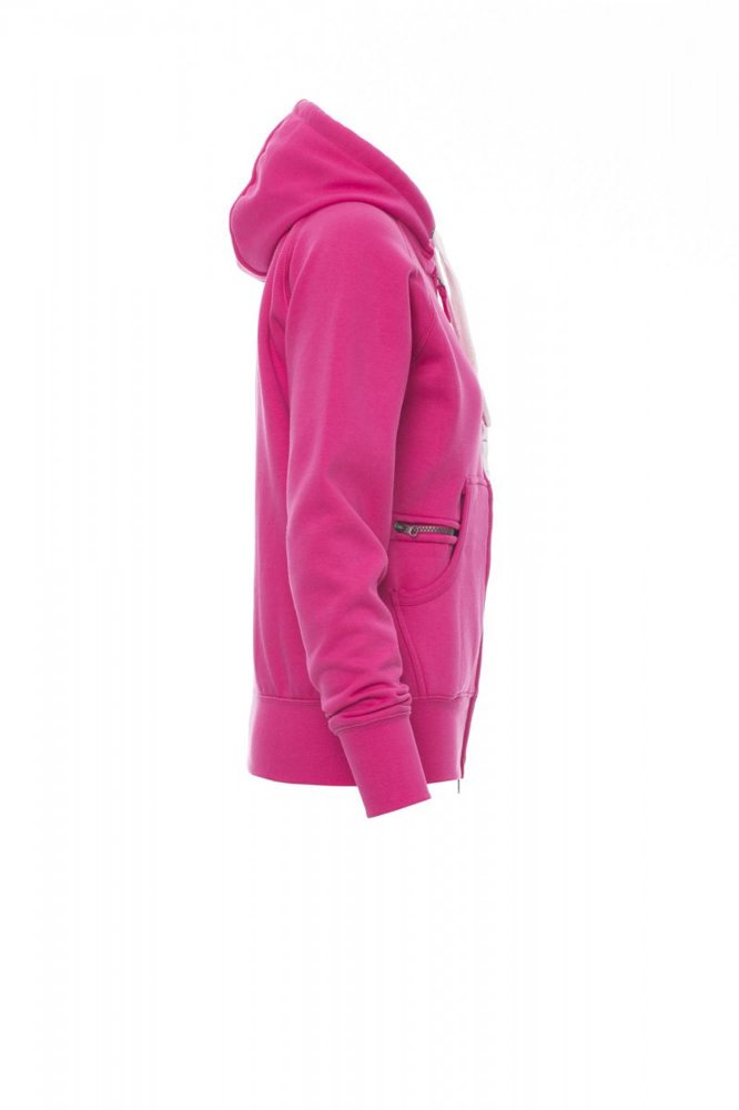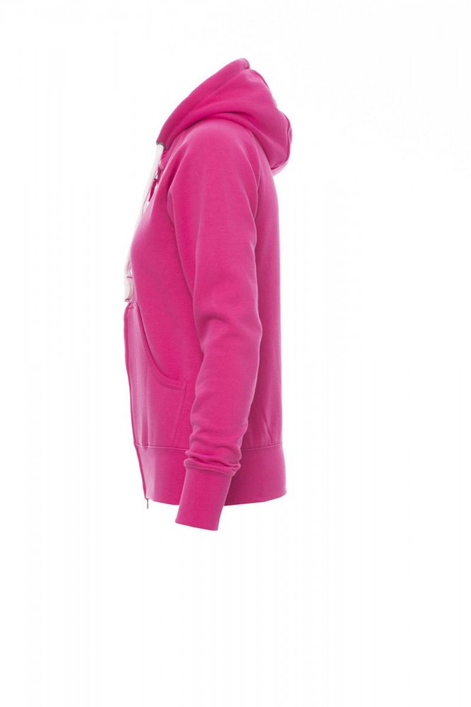 Nauwsluitende dameshoodie met doorlopende geplastificeerde SBS-rits met dubbele metalen runner, capuchon met dubbel gestikte naden en wit trekkoord met contrasterend stiksel en metalen ringen, raglanmouwen, kangoeroezakken, kleine zak met rits, ribboorden met stretch aan de zoom en mouwen, versterkte naden.