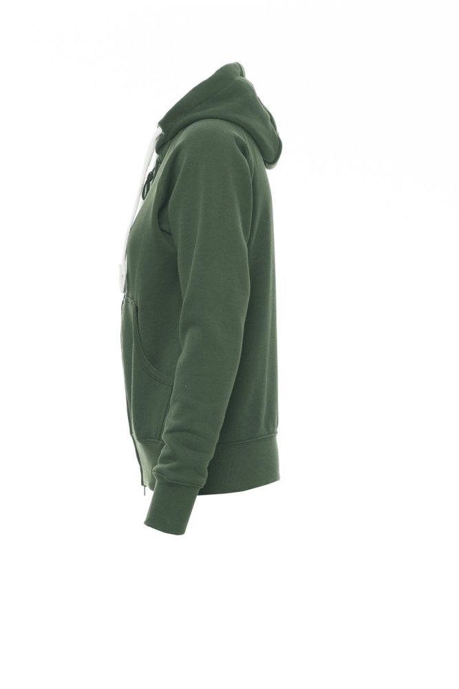 Nauwsluitende dameshoodie met doorlopende geplastificeerde SBS-rits met dubbele metalen runner, capuchon met dubbel gestikte naden en wit trekkoord met contrasterend stiksel en metalen ringen, raglanmouwen, kangoeroezakken, kleine zak met rits, ribboorden met stretch aan de zoom en mouwen, versterkte naden.