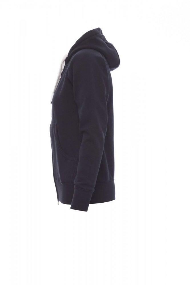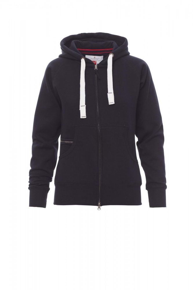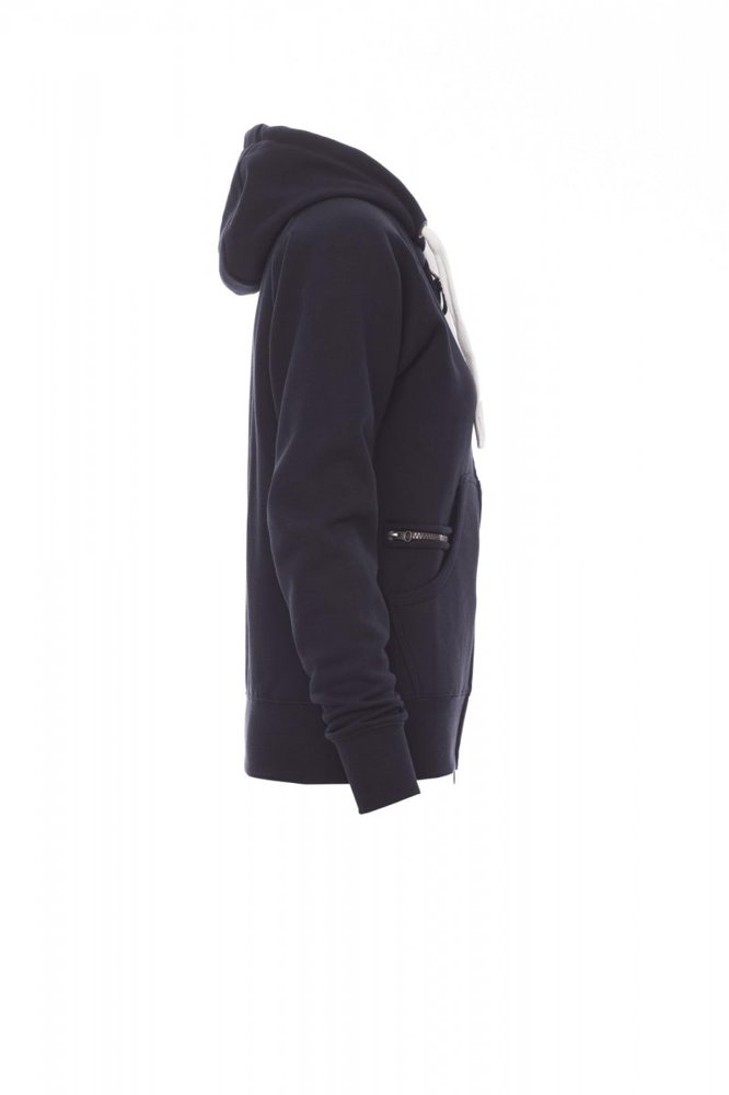 Nauwsluitende dameshoodie met doorlopende geplastificeerde SBS-rits met dubbele metalen runner, capuchon met dubbel gestikte naden en wit trekkoord met contrasterend stiksel en metalen ringen, raglanmouwen, kangoeroezakken, kleine zak met rits, ribboorden met stretch aan de zoom en mouwen, versterkte naden.