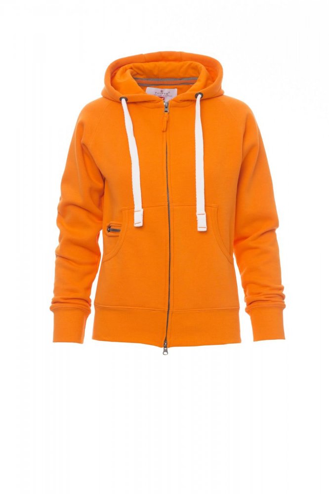 Nauwsluitende dameshoodie met doorlopende geplastificeerde SBS-rits met dubbele metalen runner, capuchon met dubbel gestikte naden en wit trekkoord met contrasterend stiksel en metalen ringen, raglanmouwen, kangoeroezakken, kleine zak met rits, ribboorden met stretch aan de zoom en mouwen, versterkte naden.