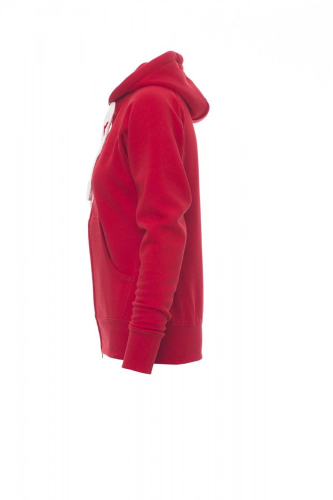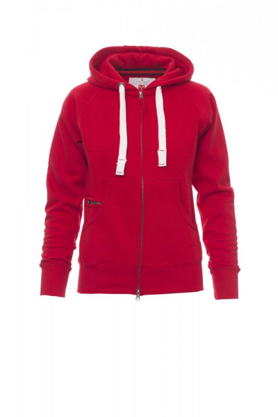 Nauwsluitende dameshoodie met doorlopende geplastificeerde SBS-rits met dubbele metalen runner, capuchon met dubbel gestikte naden en wit trekkoord met contrasterend stiksel en metalen ringen, raglanmouwen, kangoeroezakken, kleine zak met rits, ribboorden met stretch aan de zoom en mouwen, versterkte naden.