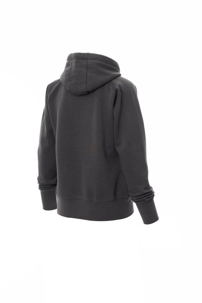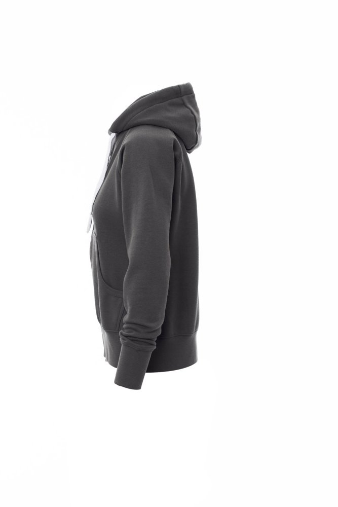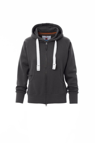 Nauwsluitende dameshoodie met doorlopende geplastificeerde SBS-rits met dubbele metalen runner, capuchon met dubbel gestikte naden en wit trekkoord met contrasterend stiksel en metalen ringen, raglanmouwen, kangoeroezakken, kleine zak met rits, ribboorden met stretch aan de zoom en mouwen, versterkte naden.