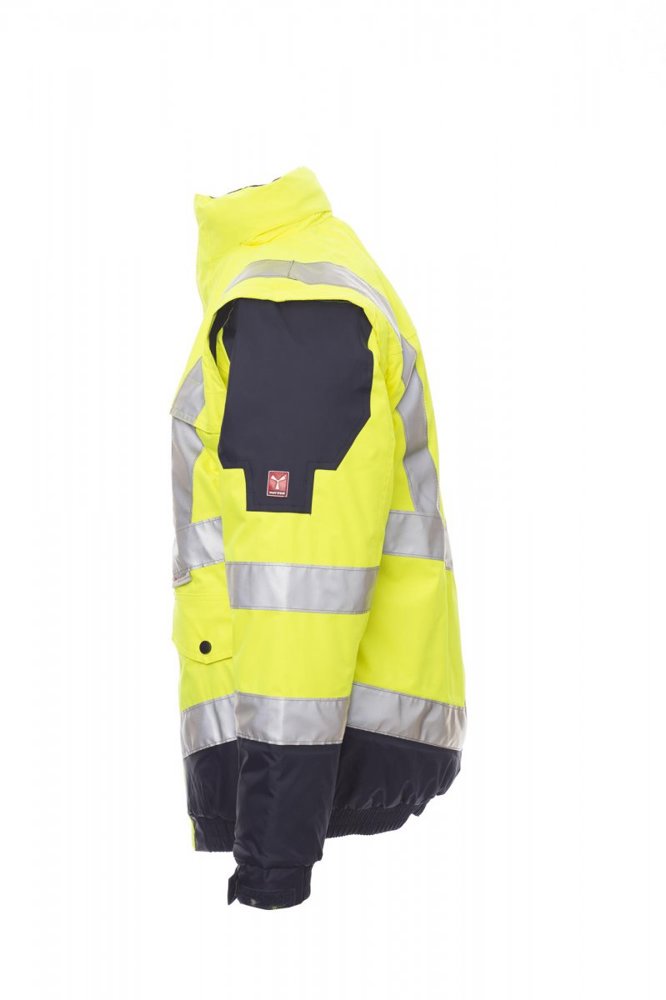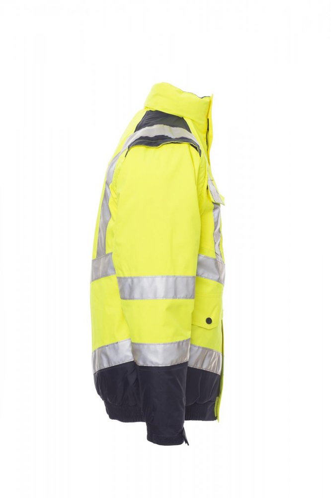 Tweekleurige jas met hoge zichtbaarheid, met reflecterende strepen, opening met afgedekte rits van kunststof, met metalen runner met overslag en klittenband, afneembare capuchon met trekkoord en/of invouwbaar in de kraag, afneembare mouwen met polssluiting, elastische taille, verstelbare manchetten. 4 zakken vooraan met klep: borstzak rechts met klittenband, uitklapbare penhouder en badgehouder, borstzak met afgedekte ritssluiting, 2 onderaan met opening bovenaan, met rits en drukknoop en opening aan de zijkant. Niet-afneembare gewatteerde binnenkant, met kraag en schouders van microfleece, rits aan de onderkant achteraan om bedrukken en borduren te vereenvoudigen, met twee strepen rond de borstkas, de schouders en de mouwen. Gesealde naden.