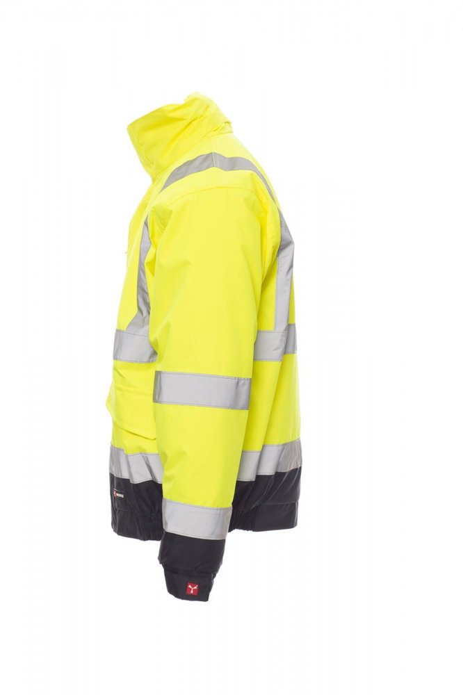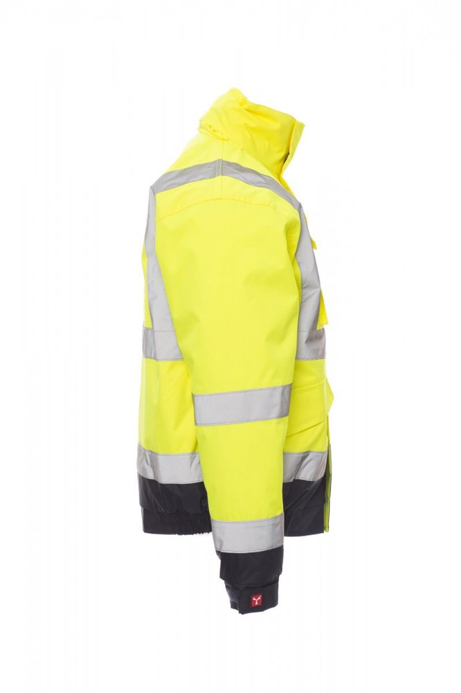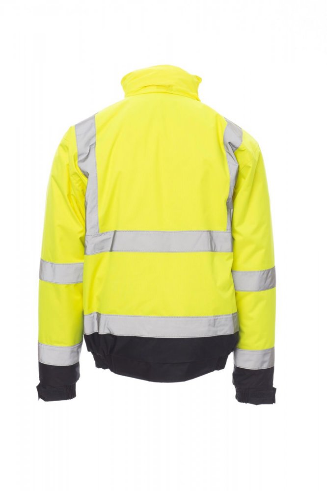 Tweekleurige jas met hoge zichtbaarheid, met reflecterende banden, doorlopende afgedekte rits, uitvouwbare capuchon, elastische tailleband en manchetten, twee ruime voorzakken met overslag en klittenband, zakje voor mobiele telefoon en bevestigingsring voor badgehouder. Binnenzijde: gewatteerd, een zak met klittenband, thermogelaste naden.