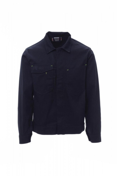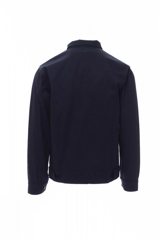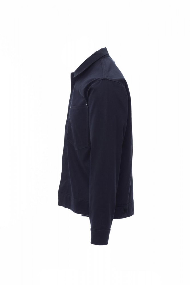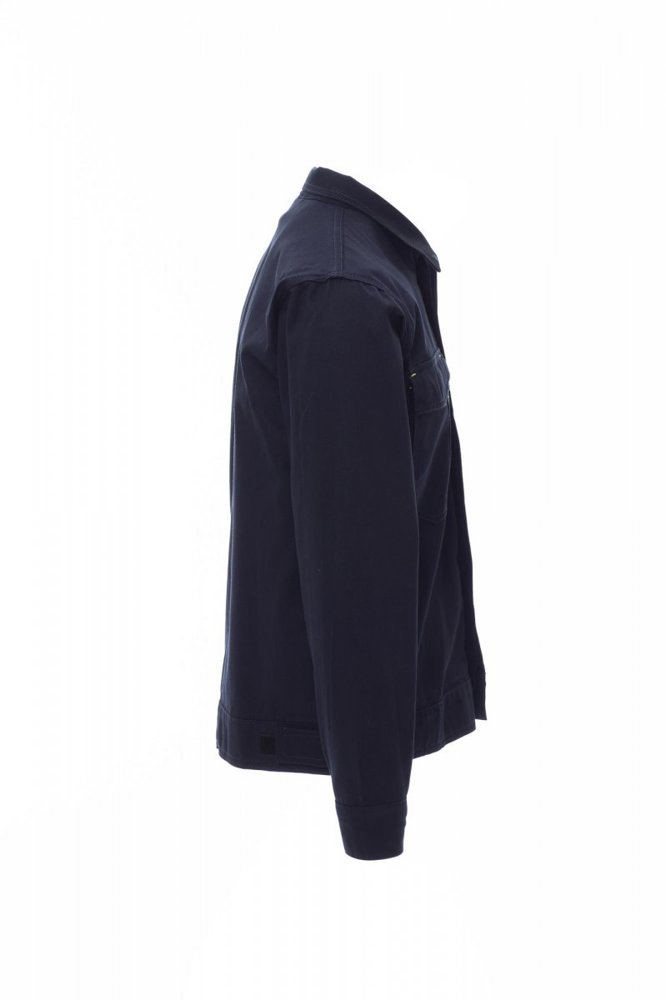 Ongewatteerde jas in nauwsluitend model in jeansstijl, voorsluiting met bedekte kunststof knopen. Twee borstzakken waarvan een met ruimte voor smartphone, badgehouder, penhouder en sluiting met overslag en klittenband. Sluiting aan de pols met knoop en verstelbare taille met klittenband. Binnenzijde niet gevoerd.