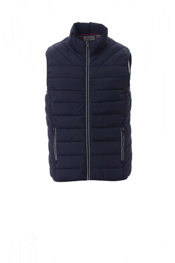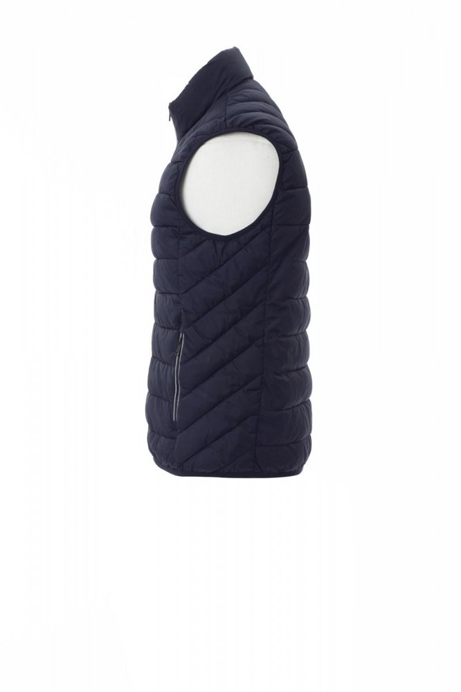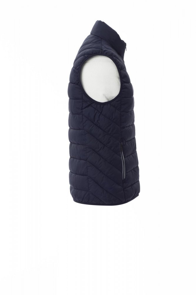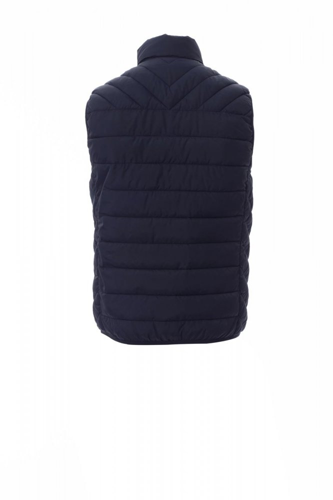 Gilet/gevoerde herenjack, plastic rits 5mm met metalen treklipje, dunne bies ter hoogte van de lendenen, twee zakken aan de buitenkant. Binnenkant: polyester voering met donseffect, twee zakken.