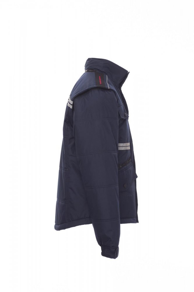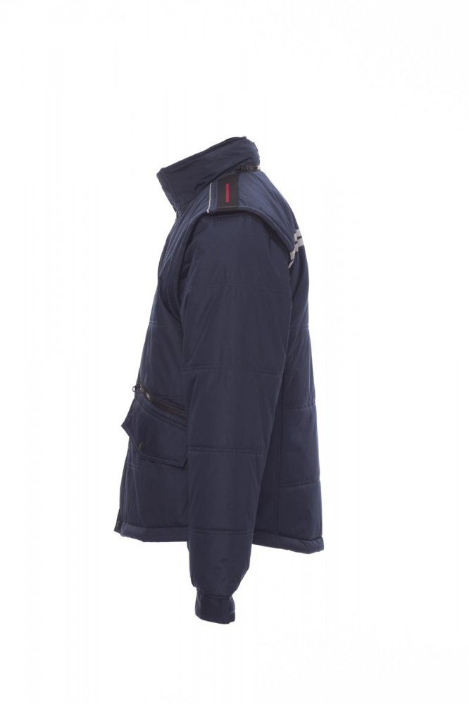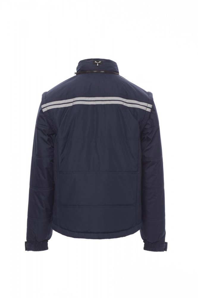 Herenjas, afneembare mouwen, kunststof rits van 8 mm met metalen runner met overslag en kunststof knopen, gevormde rug, uitvouwbare capuchon, twee buitenzakken met LOCK SYSTEM en twee met rits, schuine zakken voor gemakkelijker toegang, een borstzak voor smartphone en ring voor badgehouder, reflecterende banden op de zak en de rug. Binnenzijde: gewatteerd, contrasterende voering van fleece bij de rug en kraag, een binnenzak, rits aan binnenzijde om bedrukken en borduren te vereenvoudigen.