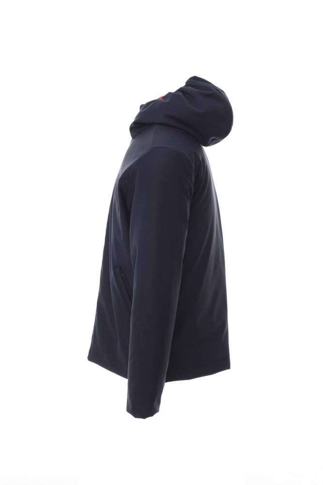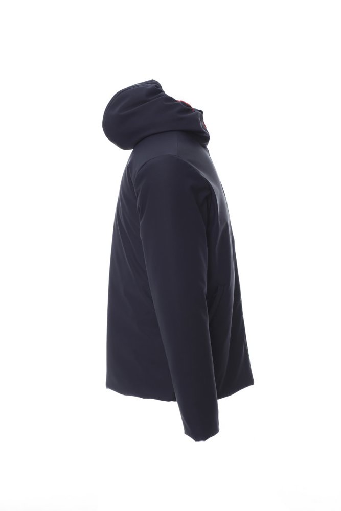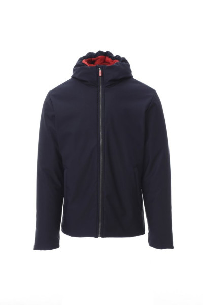 WP 8000 mm H2O, WVT 3000 g/m² 24u. Gevoerde soft-shell herenjas met capuchon, kunststof SBS-rits over de hele lengte met metalen “semi-autolock”-runner, twee zakken aan de buitenkant met rits, een binnenzak met rits.