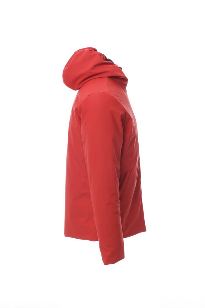 WP 8000 mm H2O, WVT 3000 g/m² 24u. Gevoerde soft-shell herenjas met capuchon, kunststof SBS-rits over de hele lengte met metalen “semi-autolock”-runner, twee zakken aan de buitenkant met rits, een binnenzak met rits.