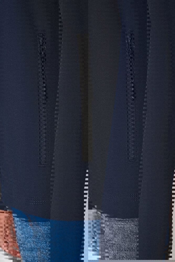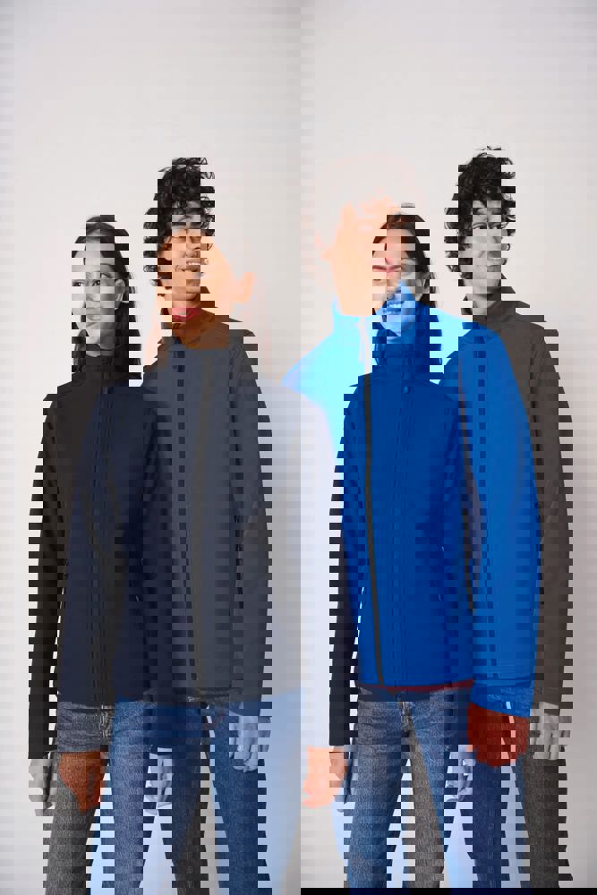 95% polyester / 5% elastaan. Softshell 2 lagen met waterafstotende behandeling. Binnenkant: zwarte micropolar van 100% polyester. Rechte snit. Twee zijzakken met polytricot voering, nylonritsen en zwarte ritstrekkers. Ritssluiting in zwart nylon met kinbescherming en ritstrekker. Schouder- en rugstukken met sierstiksels. Zwarte nektape aan de binnenzijde. Mouwboorden en zoom afgewerkt met dubbele stiksels. Afneembaar merklabel.