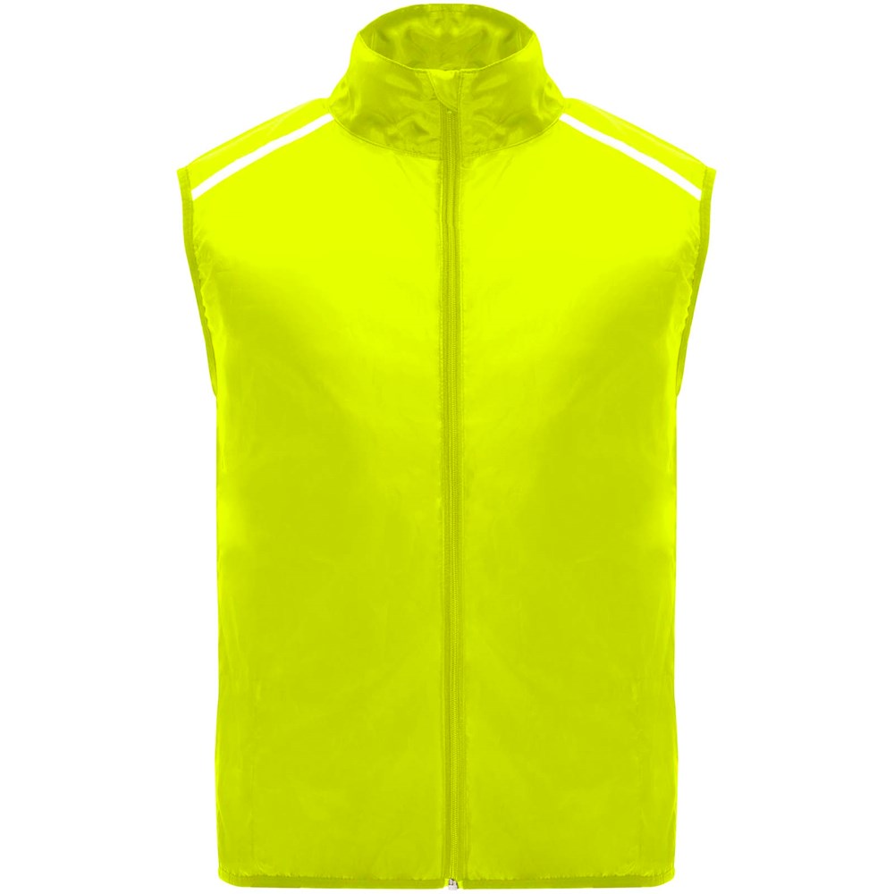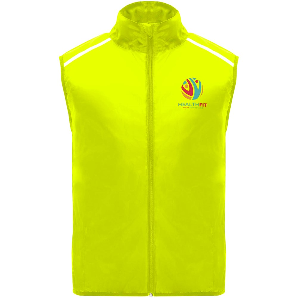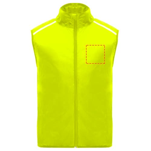 Winddicht en ademend. Rits aan de voorkant met bijpassende kinbeschermer. Elastische binding bij armsgat en aan de onderkant. Onderste deel van de rug is van micro-geperforeerde stof. Goed zichtbare details op de boven-, voor- en achterkant. Zakje met elastische band om de bodywarmer op te bergen en om de pols te dragen. Verwijderbaar label.
