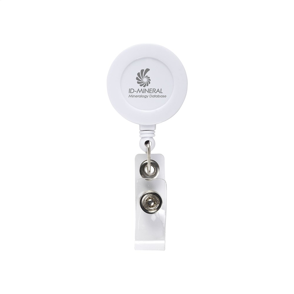 Badgehouder met metalen bevestigingsclip, oprolbaar nylon koord en badgeclip met drukknoop.meer