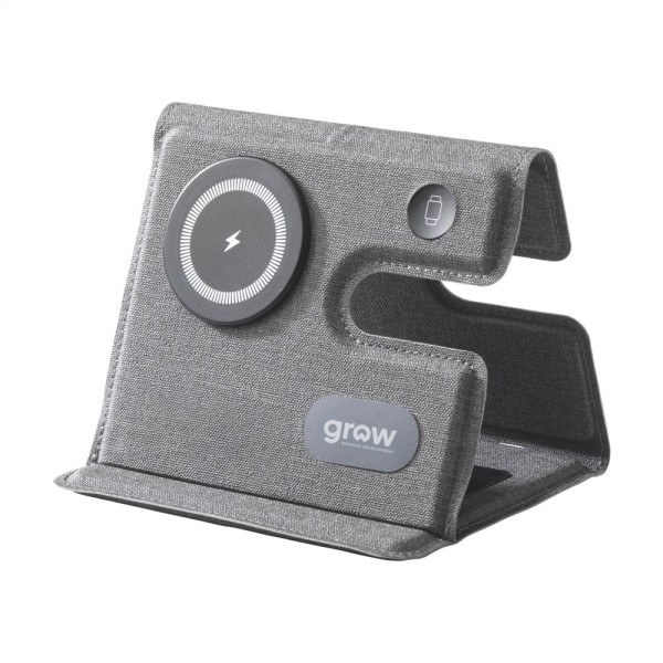 3-in-1 magnetische, draadloze 15 W oplader van gerecycled ABS en gerecycled PU met een grijs gemêleerd motief. Dit laadstation ondersteunt het snel draadloos opladen: 15W voor een mobiele telefoon 2,5W voor je iWatch en 3W voor TWS oortjes. Input: 1 x USB-C 9V/3A. De ingebouwde, magnetische snellader is compatible met alle apparaten die Qi draadloos laden ondersteunen. Plaats dit docking station op je bureau en je werkplek blijft opgeruimd en je devices opgeladen. Opvouwbaar en gemakkelijk mee te nemen. Inclusief USB-C/USB-C oplaadkabel en gebruiksaanwijzing. RCS-gecertificeerd. Totaal gerecycled materiaal: 49%. Per stuk verpakt.