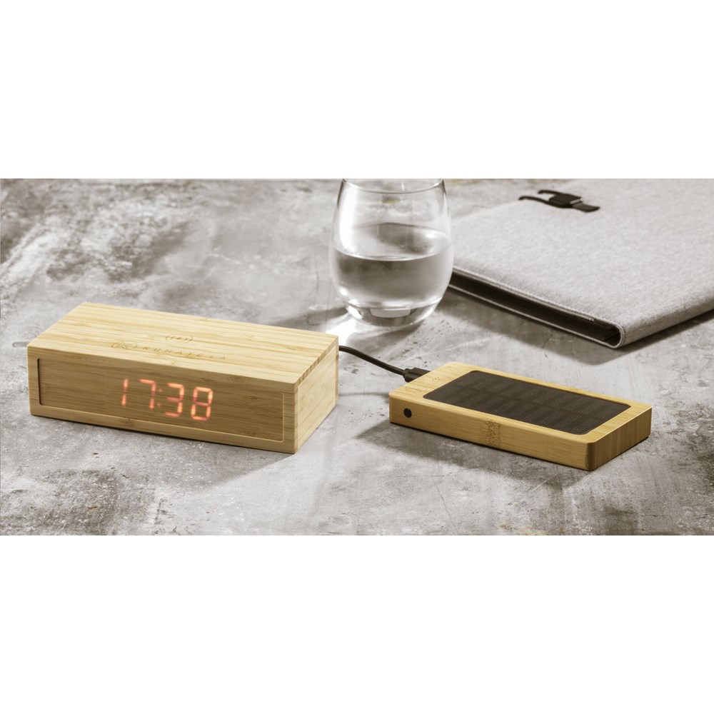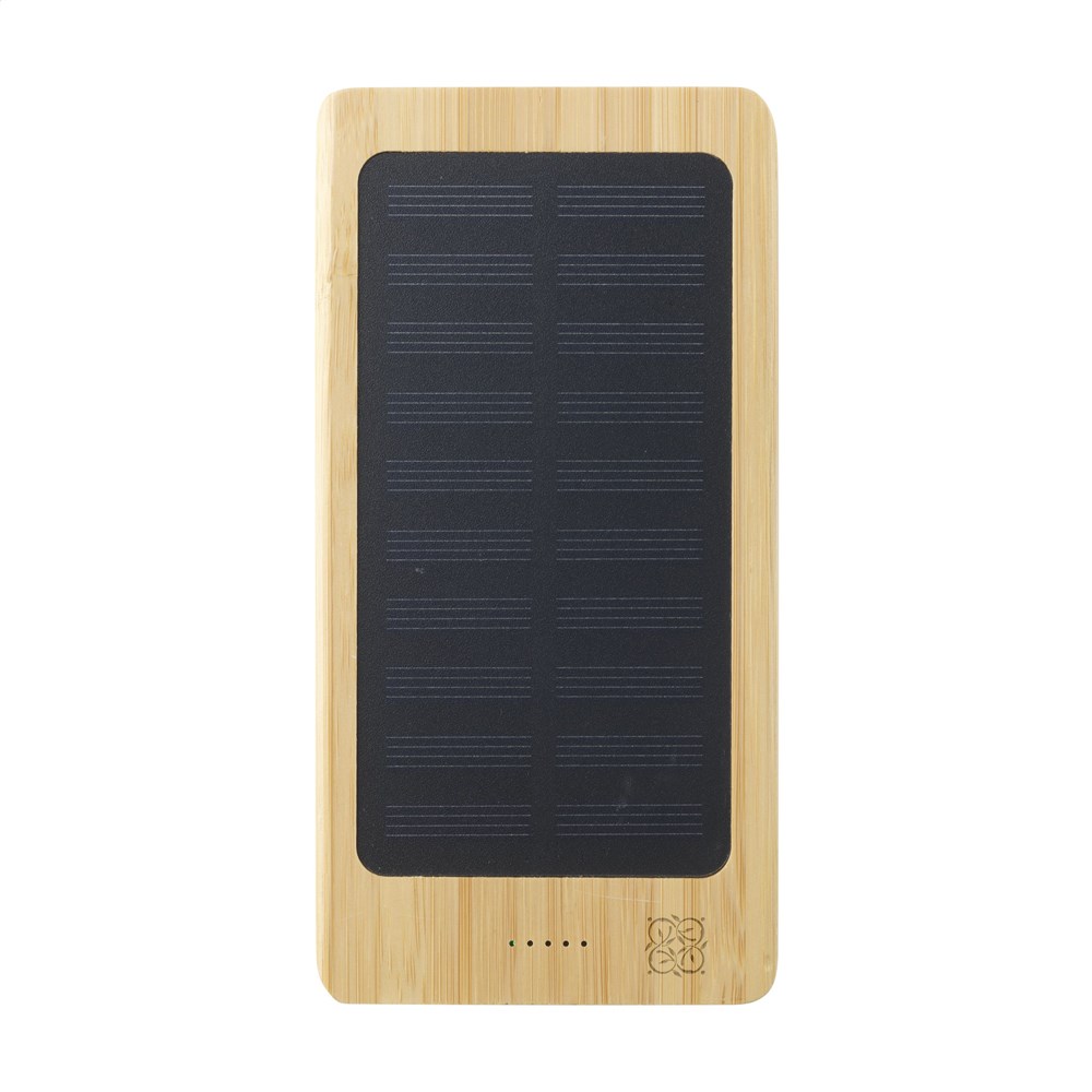 Krachtige, hoge capaciteit, FSC 100% gecertificeerde bamboe powerbank en lader voor het draadloos opladen van mobiele telefoons. Voorzien van solarpanel en ingebouwde, oplaadbare polymeebatterij (8.000 mAh). Compatibel met alle mobiele apparaten die QI draadloos laden ondersteunen (nieuwste generaties Android en iPhone). Op te laden met zonne-energie of netstroom (d.m.v. USB poort) Input: 5V/2A (max). Output: 5V/2A. Met LED-indicatoren. Inclusief USB-C oplaadkabel en gebruiksaanwijzing. Per stuk verpakt.