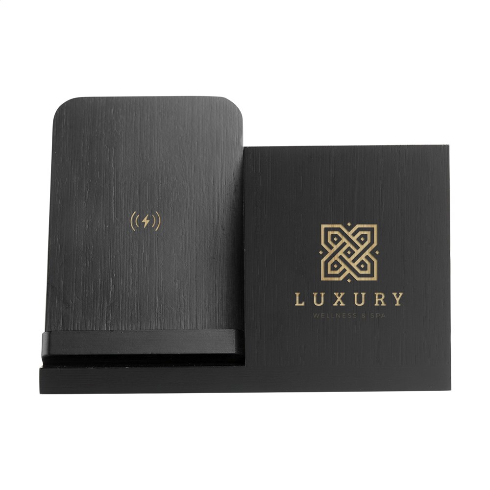 Draadloze 15W oplaadstandaard en pennenhouder in één. Dit bureauaccessoire is van hoogwaardig FSC 100% gecertificeerd bamboe. De 15W oplader is ideaal voor het opladen van mobiele telefoons. Compatibel met alle mobiele apparaten die QI draadloos laden ondersteunen (nieuwste generaties Android en iPhone). Input: 9V/2A. Draadloze output: 15W. In de handige houder bewaar je pennen en kleine voorwerpen. Zo houd je je bureau overzichtelijk en georganiseerd. Inclusief PVC-vrije oplaadkabel USB-C naar USB-C en gebruiksaanwijzing. Per stuk verpakt.