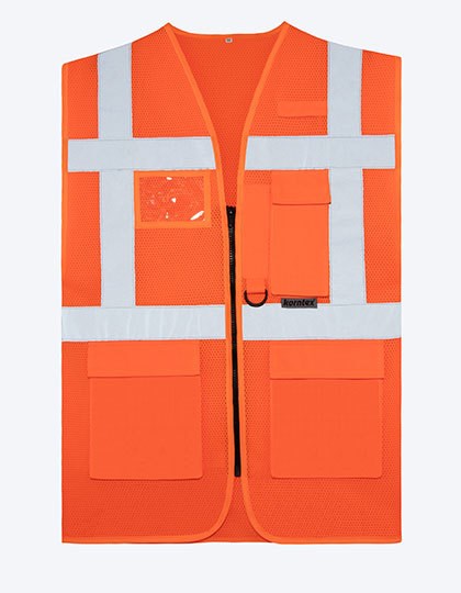 Multifunctioneel vest uit gaas met hoge zichtbaarheid, ritssluiting en zakken | Comfortabel, zelfs bij hoge temperaturen, dankzij de netstof en een losse pasvorm | Twee reflecterende strepen rond het lichaam en over de schouders, elk 5 cm breed, voor goede zichtbaarheid | Met verschillende zakken en een D-ring | Gecertificeerd volgens EN ISO 20471