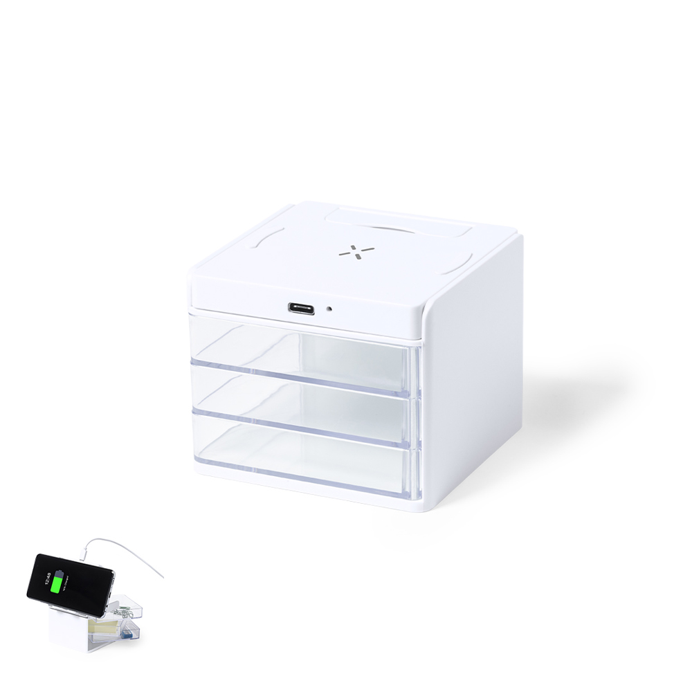 Oplader organizer met smartphonehouder en geïntegreerde 10W draadloze oplader, compatibel met apparaten die zijn uitgerust met Qi draadloze oplaadtechnologie. Met 3 transparante, afneembare opbergvakken. Oplaadstatusindicator, met 1m Type C oplaadkabel inbegrepen. Antislip basis en gepresenteerd in een individuele kraft design doos, met handleiding in het Engels en Spaans.Vervaardigd volgens RoHS-normen en in overeenstemming met de volgende veiligheidseisen:Beveiligingssysteem tegen oververhitting.Beveiligingssysteem tegen overbelasting.Blokkadesysteem om kortsluiting te voorkomen.