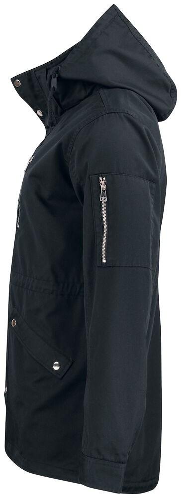 Luchtige jas met dunne voering en eigentijdse uitstraling door de afwerking met metalen ritsen en drukknopen. De jas is voorzien van een capuchon die kan worden weggestopt in de kraag. De zakken op de borst, voorzijde, mouw en aan de binnenzijde zorgen voor voldoende opbergruimte. De jas is gemakkelijk te veredelen dankzij de drukkersrits aan de binnenzijde. Kortom, de ideale tussenjas.