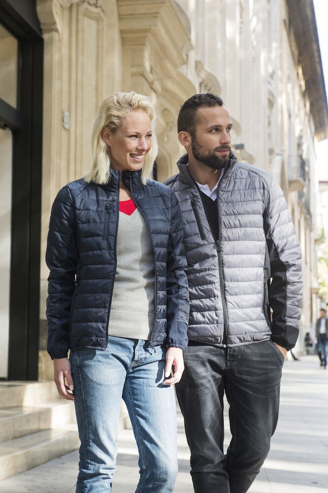Opvallende gewatteerde jas met eigentijds design en een moderne pasvorm. De jas is zorgvuldig afgewerkt met elastiek in de boord en onderaan de mouwen, zijpanelen van softshell, necktape en ritsen. De jas is voorzien van twee steekzakken met rits, een borstzak met rits en binnenzakken. Deze moderne jas zorgt voor een professionele en eigentijdse uitstraling. Ideaal voor degene die op subtiele wijze op wil vallen.
