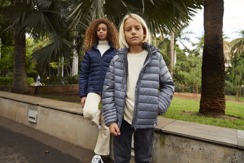 Moderne jas voor kinderen gevoerd met imitatie dons voor een aangenaam warm gevoel. De jas is voorzien van een afneembare capuchon, rits aan de voorzijde, twee steekzakken met rits, een borstzak met rits en twee binnenzakken. Verder is de jas voorzien van een AC coating voor bescherming tegen wind en regen.