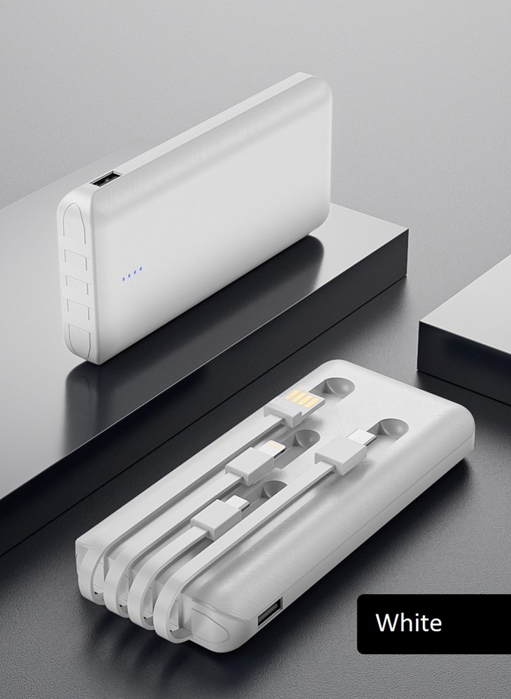 Mobiele snelle oplader voor snel opladen met geïntegreerde oplaadkabels. Aansluitingen: Micro-USB, USB-C, Apple Capaciteit: 10.000 mAh. Formaat: ca. 140 x 68 x 20 mm. Kleuren: zwart, wit. Afwerking: inclusief 1c-afdrukken in één positie. Verpakking: witte vouwdoos.