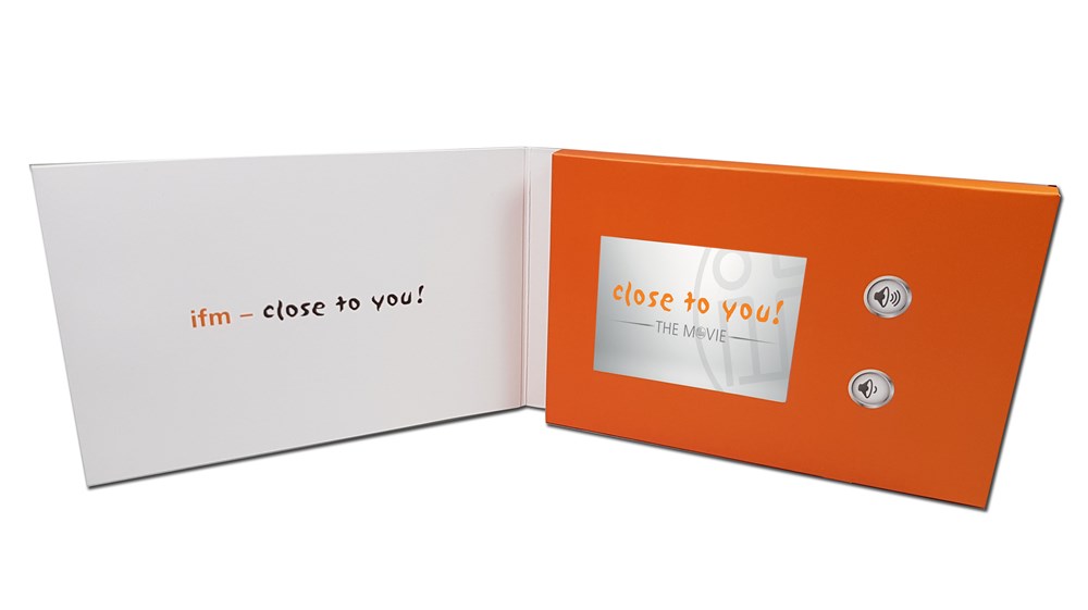Gevouwen kaart gedrukt in klantontwerp met geïntegreerd IPS-display. Formaat: DIN A5, DIN A6 of DIN lang, andere formaten op aanvraag. Print: 4/0 gekleurd + matte of glanzende vernis. Inclusief: video-opname, startlogo, maximaal drie bedieningsknoppen. Prestaties: 3-inch IPS-scherm (62,5 x 42 mm) voor haarscherpe beelden vanuit alle hoeken, resolutie: 640 x 480 px, 2 uur batterijduur, 256 MB opslagcapaciteit, geïntegreerde luidspreker, met punch-out op aanvraag, videogegevens optioneel uitwisselbaar of met een wachtwoord beveiligd.