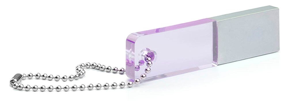 Dunne aluminium USB flash drive met een top deel van acryl wat oplicht wanneer de flash drive in een USB poort zit.