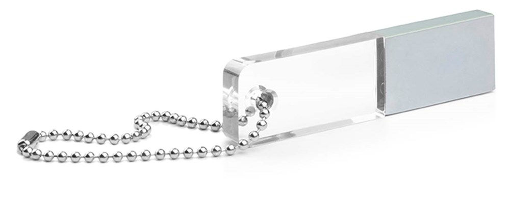 Dunne aluminium USB flash drive met een top deel van acryl wat oplicht wanneer de flash drive in een USB poort zit.